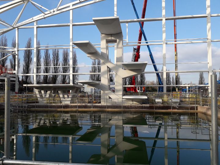 Another significant milestone has been reached at the Sandwell Aquatics Centre in Smethwick after the dive tower, which will be used for the diving competition at the Birmingham 2022 Commonwealth Games, was completed. The dive tower, which took five weeks to build, includes 31 separate English made, concrete pieces weighing 233 tonnes in total. The structure is 10m and took five people 2000 hours to build.