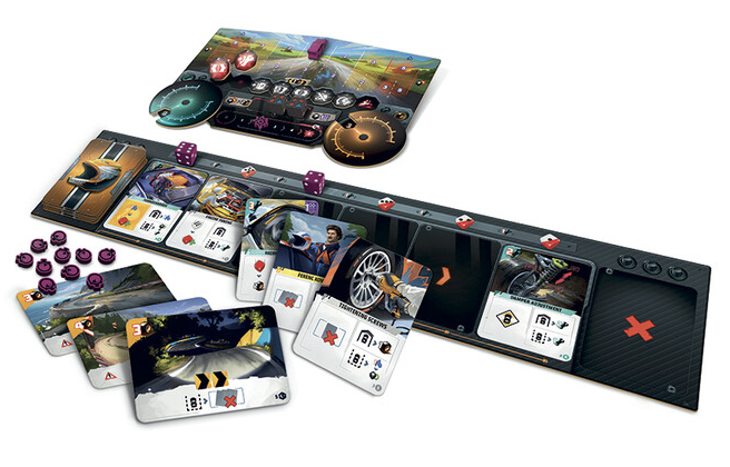 Players (1 to 4) start with a basic action deck and a unique pilot, then acquire more cards throughout the game to tune their vehicle and improvgame performance as they manage suspension settings, adjust tire pressure, tweak the differential, and so forth... Actions are activated based on which dice slot they are linked to, and driving style choices - fast or cautious - further impact the effects of each card.